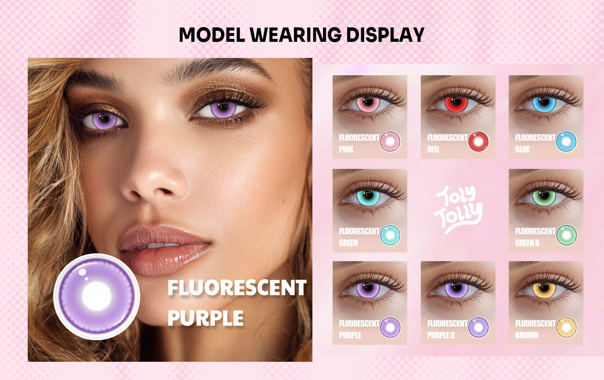Turn heads with the TolyTolly Fluorescent Purple contact lenses—designed to deliver a striking, luminous purple effect that brings any character to life. These lenses combine a vibrant violet tone with fluorescent highlights, creating a standout glow ideal for cosplay, themed events, nightlife, and fantasy makeup looks.
