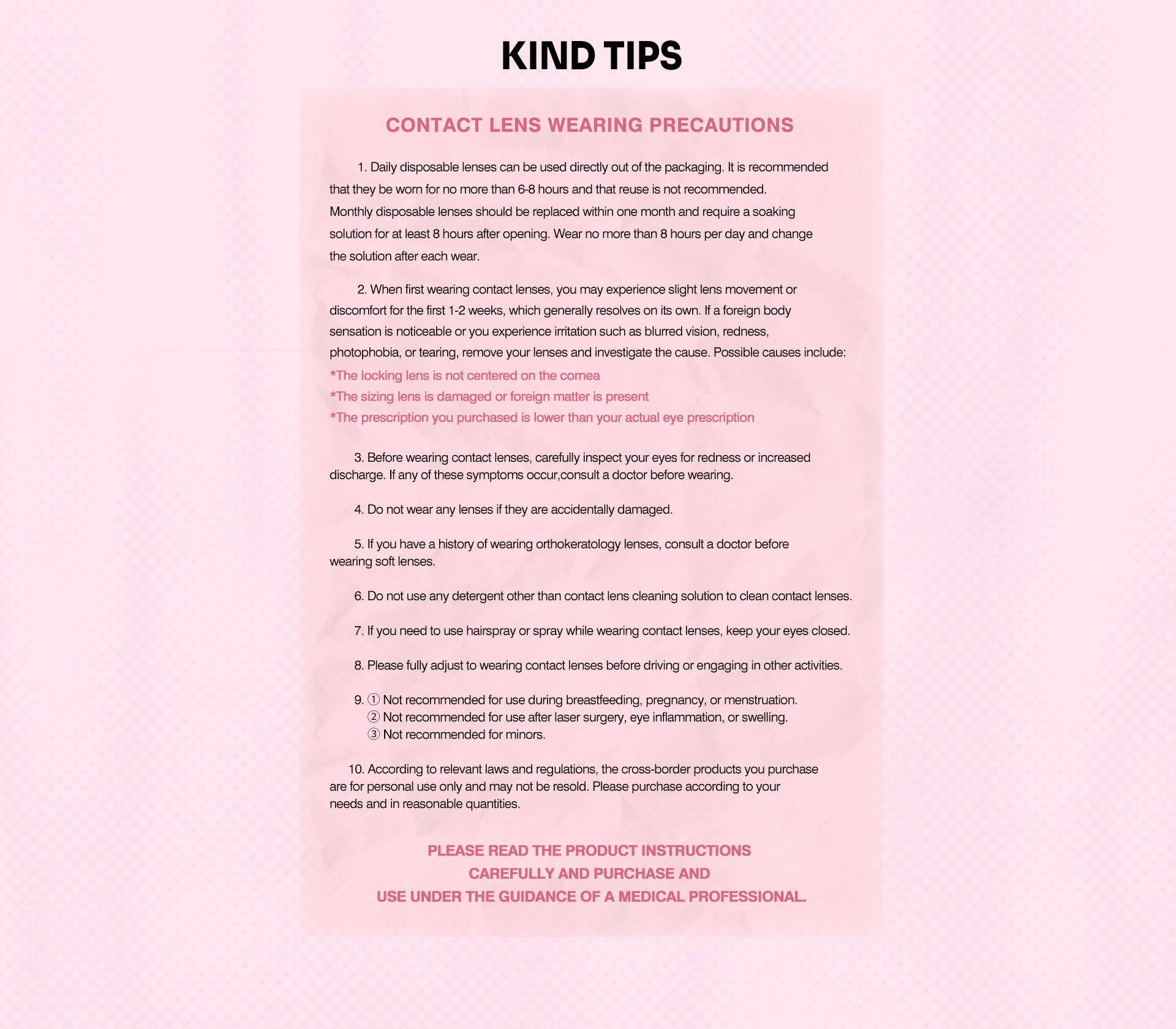 - Prima di indossarli per la prima volta, si prega di immergere le lenti in una soluzione per lenti a contatto multiuso per almeno 6 ore.