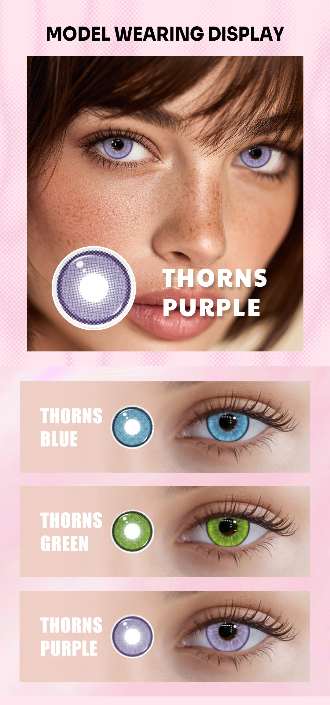 Transform your look with TolyTolly Thorns Purple colored contact lenses — a rich, eye‑catching purple shade that enhances your natural eye color with bold flair. Featuring a 14.5 mm diameter, 8.5 mm base curve, and 38% water content, these lenses are designed for comfortable wear and a dramatic visual effect. With a natural lens type and 1‑year frequency, Thorns Purple is ideal for cosplay, themed events, photoshoots, or everyday style that makes your eyes pop. Whether you want a bold fashion statement or a unique finish for special occasions, these lenses give you expressive, vibrant purple eyes.